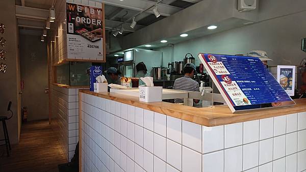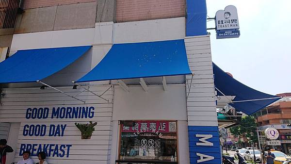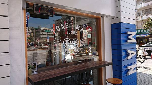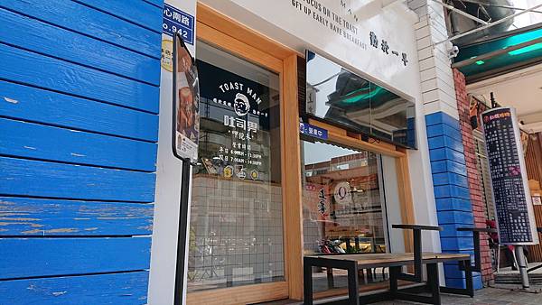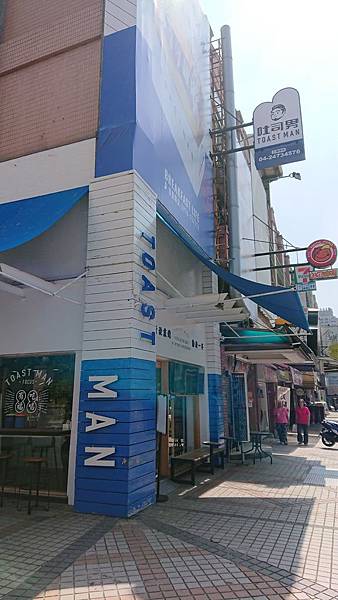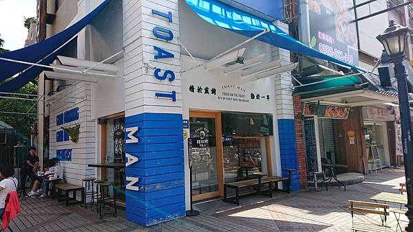 吐司男的外部裝潢是白色牆壁與藍色的遮棚