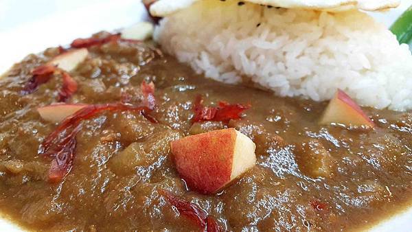 咖哩上面有洛神花與蘋果 擺盤很有美感