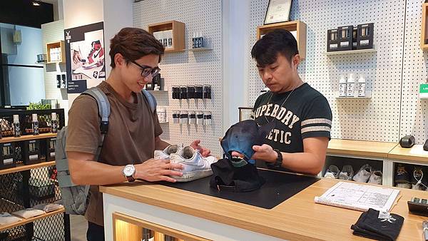 店長會檢查鞋子,並說明鞋子的髒污或受損狀況
