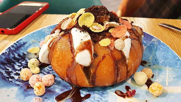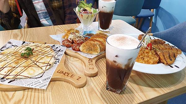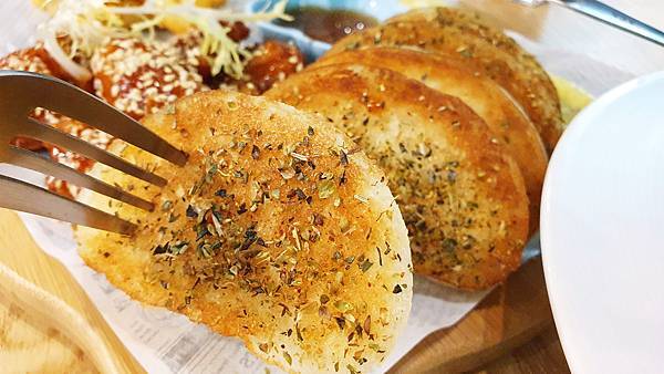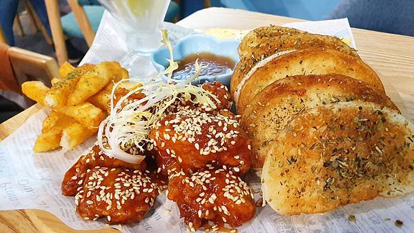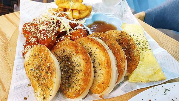 我們點了玉米菇菇烤餅、夏日海味漁夫蝦排、韓國歐巴嫩雞、炸饅頭與鮮奶茶